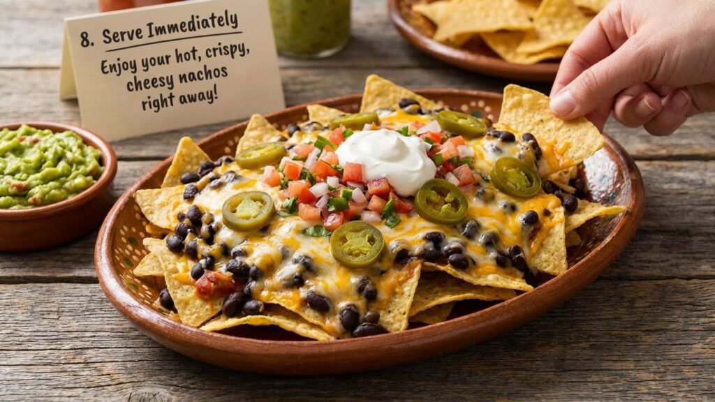- Nachos taste best when served hot, fresh, and crispy right out of the oven. Waiting too long may cause chips to soften as toppings cool. Place the tray directly on the table or transfer to a platter. Enjoy them with friends or family before the cheese firms up. Hot nachos deliver the perfect balance of crunch and melt. Serve and enjoy instantly for the best experience.